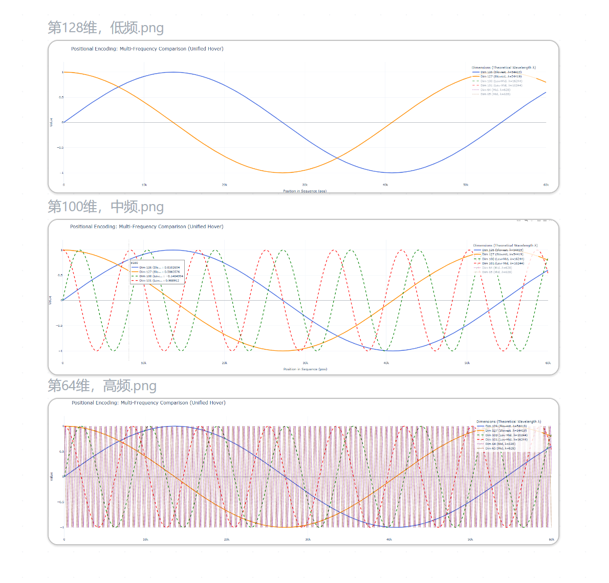 这个公式的意思可以概括为:用两个有界的函数,通过控制token在不同维度的波长,从而实现高中低维度的数值变化快慢,进而实现向量的不同维度上编码从细到粗粒度的位置信息,共同构成完整的位置表示