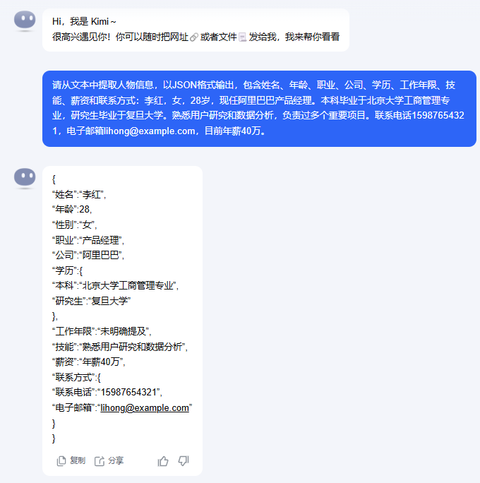 这里我们用了同样的prompt,不同的是给定的抽取文本。但是kimi给出的回答存在两个问题。