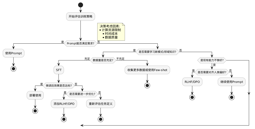 A[开始评估训练策略] --> B{Prompt能否满足需求?}