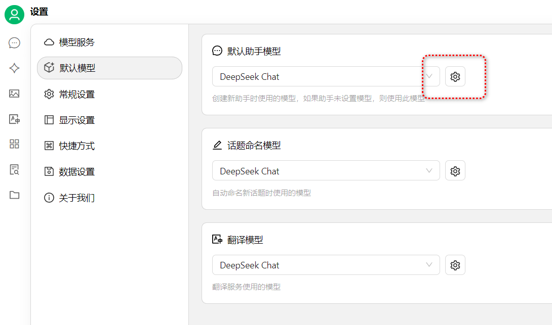 接着切到默认模型,把我们添加好的模型给默认助手模型选上。我一般使用DeepSeek Chat。