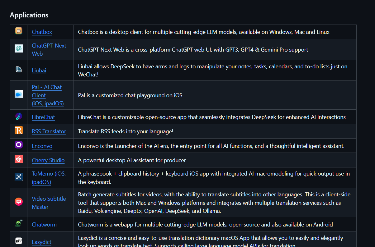 客户端选择可以很多,web的,手机的,桌面端的。这里用的是Cherry Studio,目前综合使用起来体验还不错。如果有其他去客户端需求可以查看 DeepSeek Integration (这是Deepseek提供的集成了其API的应用列表)。