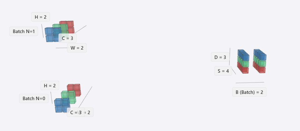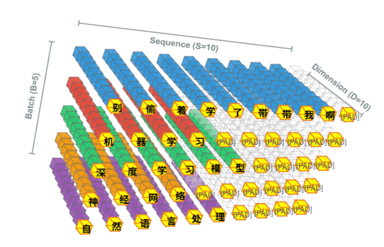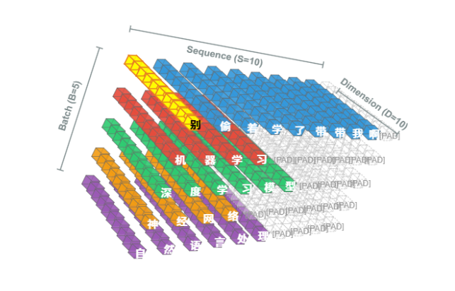在NLP中则好想象的多,数据通常被抽象为三维张量 (B, S, D),其中: