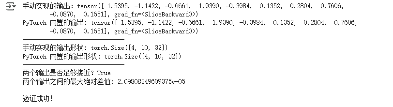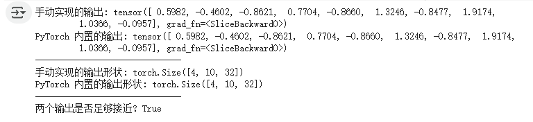 我们只查看一个,可以看出手动实现和torch自带的结果是一样的。并且我们通过allclose计算整体,得到了True
