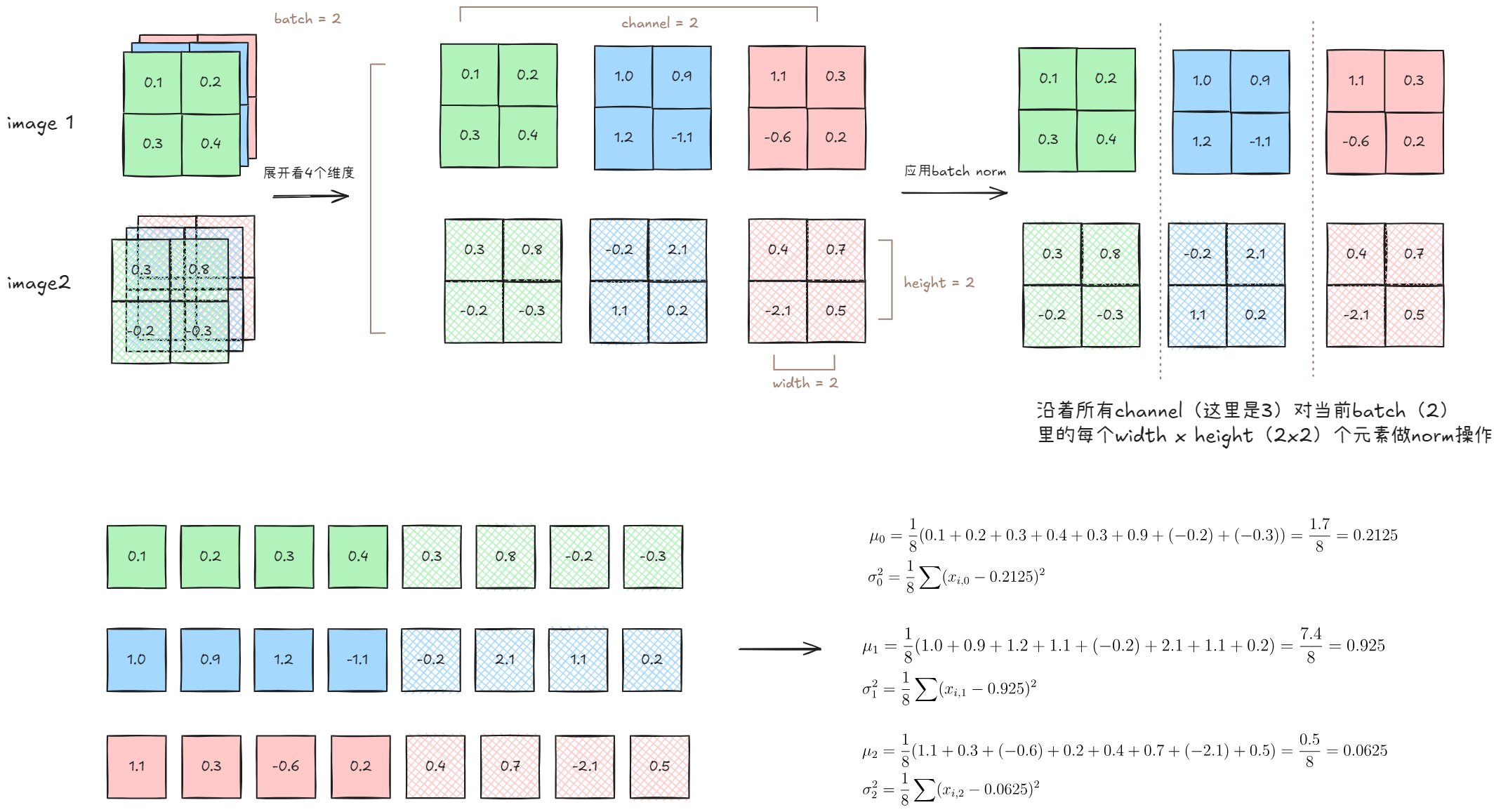 Batch Normalization 指的是逐通道计算每个通道在整个当前 Batch (mini-batch)和所有空间位置上的均值和方差,并使用这些统计量对该通道的所有激活值进行归一化,最后应用一个逐通道的仿射变换。