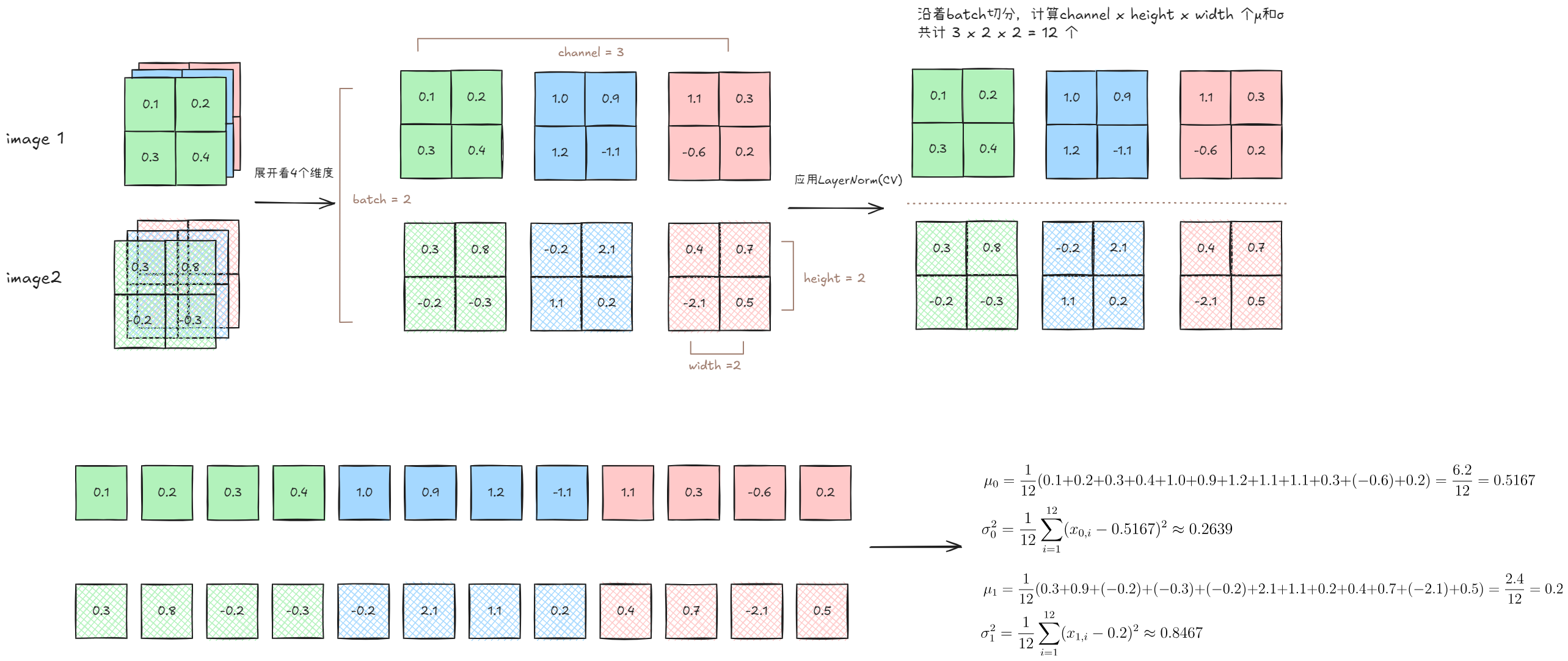 )具备可比性。 - 通道语义:特定通道在语义上具有一致性。该通道的激活图代表了网络中特定卷积核对所有输入图像提取出的同一种模式或特征,例如边缘、纹理或特定物体的部件。因此,BN将不同图像的同名通道,比如R通道,视作一个统计整体,其本质是同通道特征应服从统一分布。